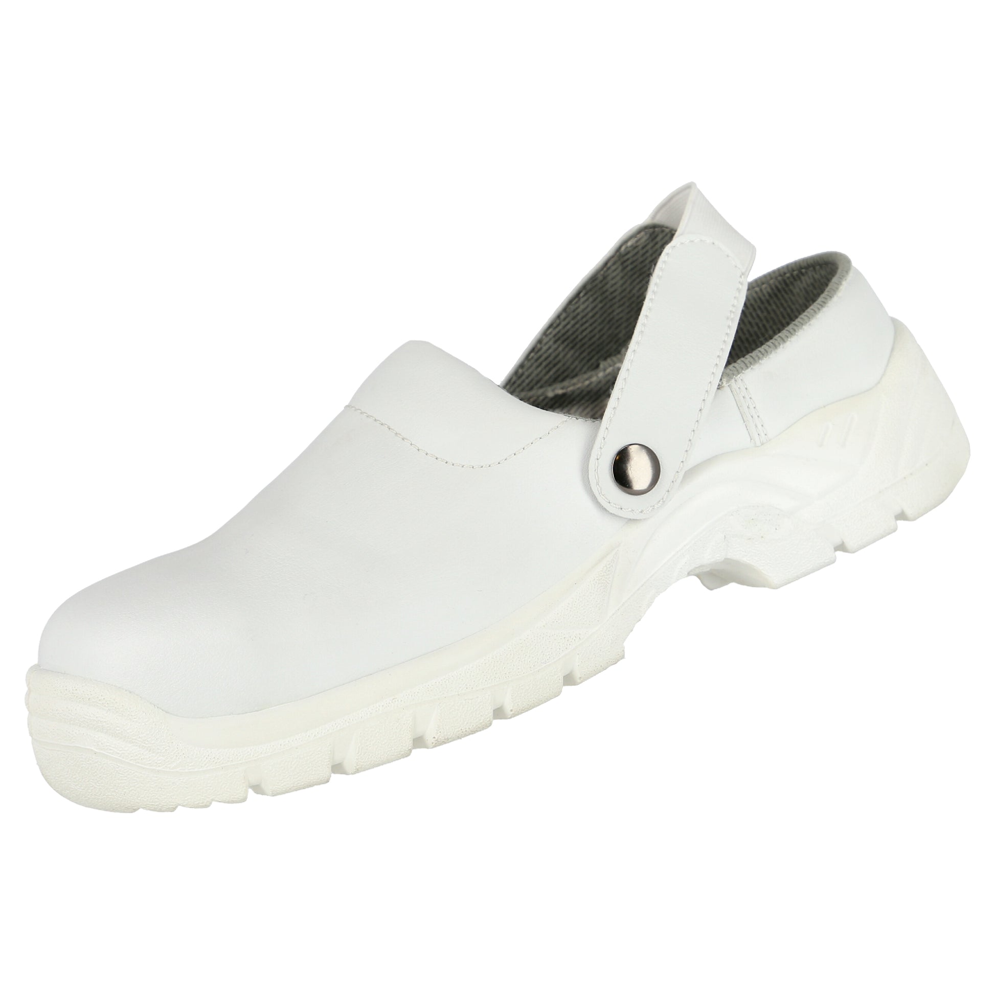 Die NITRAS CLEAN STEP CL Sicherheitsclogs vereinen ein ansprechendes Design mit höchster Funktionalität und Sicherheit. Gefertigt aus strapazierfähigem, weißem Kunstleder (Farbcode: 1100), bieten sie dank der robusten PU/PULaufsohle eine hervorragende Widerstandsfähigkeit gegen Abnutzung. Die integrierte Stahlzehenkappe schützt Ihre Füße zuverlässig vor Stoßeinwirkungen, während die ergonomisch geformte Einlegesohle für angenehmen Tragekomfort sorgt. Beste Rutschhemmung (SR) garantiert einen sicheren Stand auf verschiedenen Untergründen. Die Clogs sind nach DGUV Regel 112-191 geprüft und entsprechen der PSA-Risikokategorie II. Sie sind in den Größen 35 bis 48 und in Weite 11 erhältlich und erfüllen die Anforderungen für Typ 1 und Typ 2 Sicherheitsclogs.