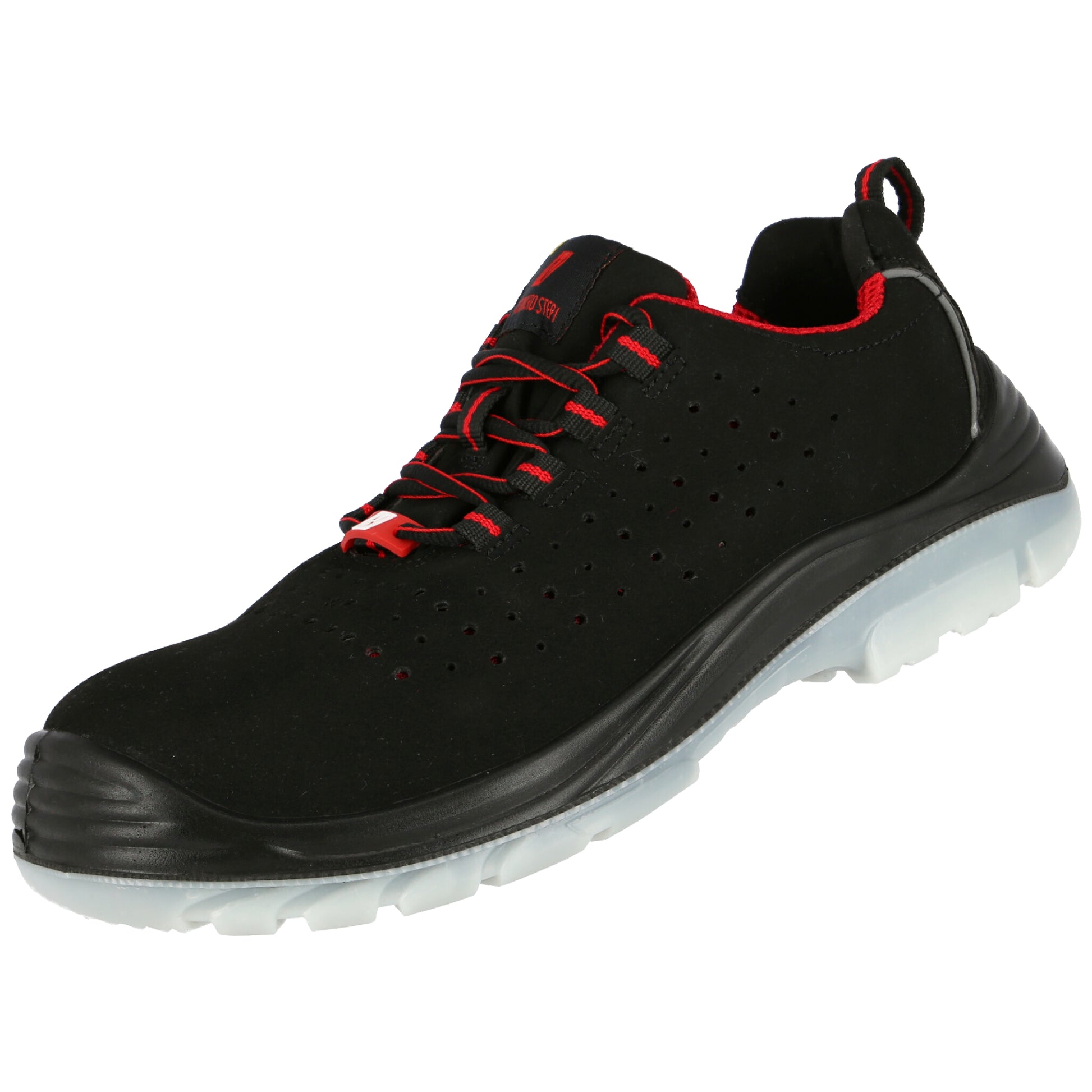 NITRAS MICRO STEP, sapatos baixos de segurança, S1 P, microfibra durável, preto (código de cor: 1000), sola durável em PU / TPU, preto / transparente, biqueira de fibra de vidro, entressola em tecido resistente a perfurações, sem metal, palmilha COMFORT STEP de alta qualidade, formato ergonômico, design atraente, melhor resistência ao deslizamento possível (SRC), largura 11, faixas refletivas no calcanhar, forro do calcanhar para fácil colocação e retirada e reforço do calcanhar em material robusto microfibra, regra DGUV 112-191 testada, tipo 1, tipo 2, compatível com ESD, categoria de risco II de EPI